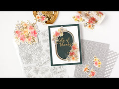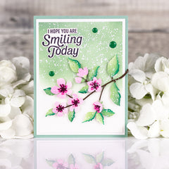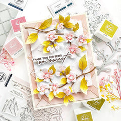 - Ink blend Lemon Whip & Sunshine over floral parts of Stencil 2 of the Cherry Blossoms layering stencil set. Die cut using the coordinating die.