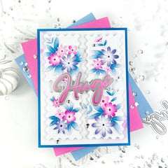 8. Using the Basic Sentiments Die Set, die cut the word "Hugs" from white card stock and the shadow piece from blue card stock and adhere them together with liquid adhesive. Finish your card by attaching this sentiment to your card front with dimensional foam tape.