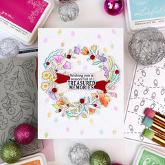 I love how this wreath, created with non-holiday florals and soft pastel colors, takes on a distinctly Christmas feel with just a few thoughtful details ! The red banner and glittering embellishments tie everything together and show how versatile these floral images can be throughout the year. I hope this card inspires you to look at your florals in a new way and experiment with unexpected color palettes for the holidays :) !