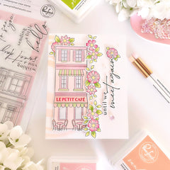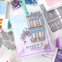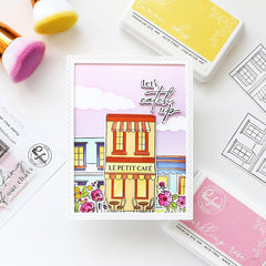 - Stamp “Le Petit Café” onto the awning and die cut the building and floral images using the coordinating dies.