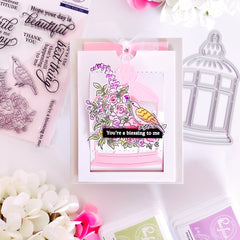- Press the sentiments from the Darling District Press Plate set in Detail Black, die cut them with the coordinating dies, and adhere them as shown.