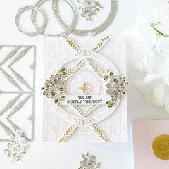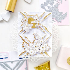 - Stamp the sentiment from Thread Full Florals using VersaMark ink. Heat emboss with Detail Silver embossing powder. Die cut the sentiment and stack it with two plain white die-cut blanks. Adhere the sentiment to the upper right corner of the postage panel using thin foam tape.