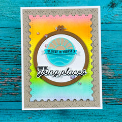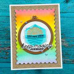 - Die cut two rectangle postage edge dies from white cardstock. Use mint tape to mask off the outer edges. Ink blend the center lightly with Misty Coast ink. Remove the tape, stack the two die cuts together, and adhere them to the card using foam tape.