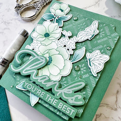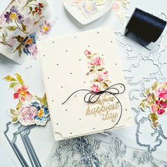 11. Attach the floral die-cut elements to the card as shown in the photos using liquid adhesive and foam adhesive for added dimension.