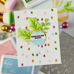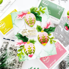 Stencil 1: Mermaid Cove (large holly leaves), Spruce Tips (small holly leaves), Raspberry Bliss (long ornament), Blue Jay (round ornament)