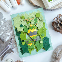 Adhere die-cut Timeless Tidings leaves and ornaments using foam adhesive to the glitter panel.