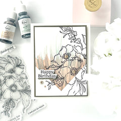 - Stamp the floral images of the Peony Glow onto watercolor paper using Detail Black ink.