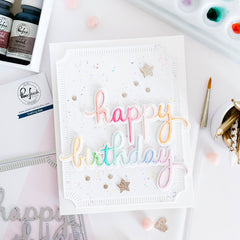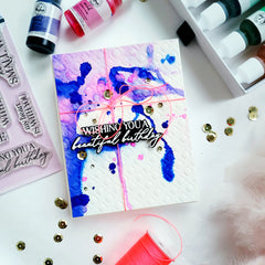 - Stamp the sentiment on a piece of watercolor paper in Detail Black, cut it using the coordinating die, and layer it with three additional die cut pieces for added dimension.