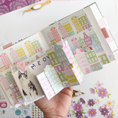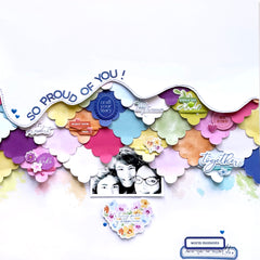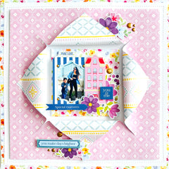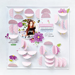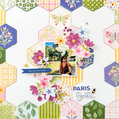 Hello crafty friends! Susi here, back in the Pinkfresh Studio blog sharing a new 12 x 12 scrapbook layout created using the beautiful Crafted Moments collection. The starting point for this project was the patterned paper of the same name, Crafted Moments, and its charming hexagonal design. These cozy patchwork- style shapes immediately inspired me to create a soft, colorful and geometric background full of texture.