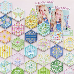 - Prepare the hexagon frame. Start by cutting out all the inner hexagons from the Crafted Moments patterned paper. Remove every interior shape carefully so that you are left with the outer hexagon frame only. This creates a beautiful patchwork window effect that will be the foundation of your layout.