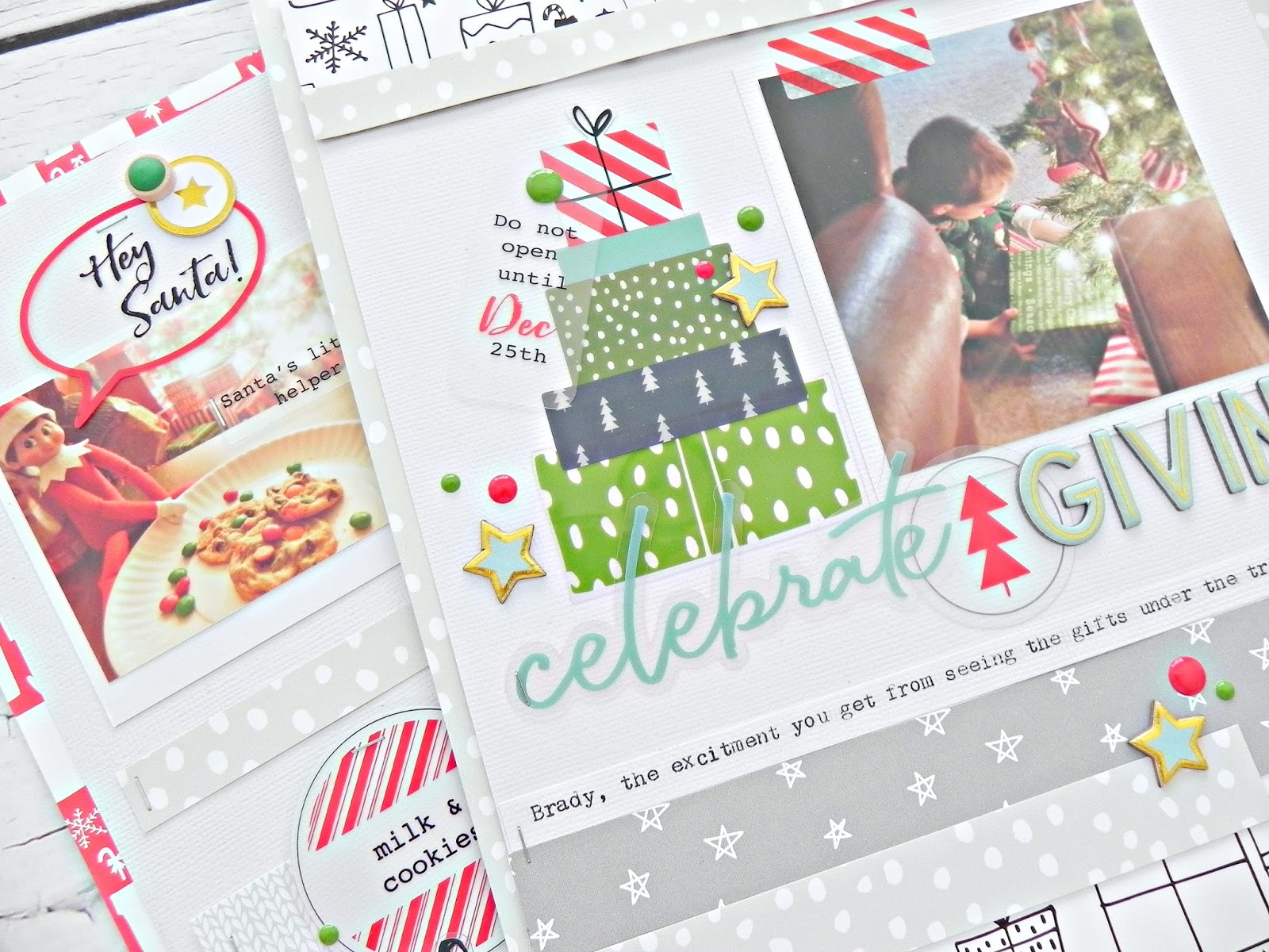 My second layout is titled "Celebrate Giving", for this one I was excited to use lots of the grey and black and white papers and added in touches of red and green with some of the other embellishments from Oh Joy.