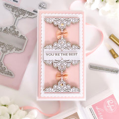 1 pc die set to coordinate with the Medallion Border press plate set. This die cuts around the image leaving a thin border. Approximate Measurements: 4.25” x 1.25”- $7.00