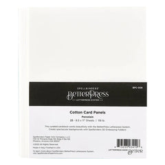 Porcelain BetterPress A2 Cotton Card Panels comes in a pack of 25 A2 (4.25 x 5.5 inch) panels in a brilliant white color. This curated 118lb. cardstock works beautifully with the BetterPress Letterpress System. Approximate Size: 4.25 x 5.50 in./10.80 x 14.00 cm- $14.00