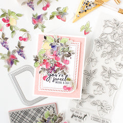 4 x 12 photopolymer clear stamp set designed by Valentine Leclerc. Made to coordinate with the Fruitalicious die, Fruitalicious layering stencils and Fruitalicious washi tape. Available for purchase separately. This innovative stamp includes all the fruit clusters on one stamp, so it pairs perfectly...- $24.00