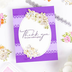 Use our innovative, one-piece dies to cut every design in one pass, giving you more time to create! The stamp set contains two stamps with all the various floral images. The washi tape includes all images in a single panel—simply align both dies on...- $25.00