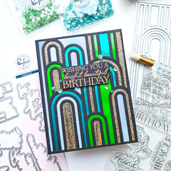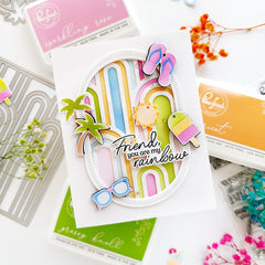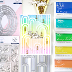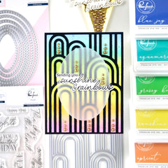 This die, designed by Kaitlin Sheaffer, features bold, modern rainbow arches, creating striking designs with ease. Coordinating product for purchase separately: Elevated Rainbows stencil Details: 4.25” x 5.5”, 1 piece Made of high-quality steel Packaging includes a finished example- $21.00