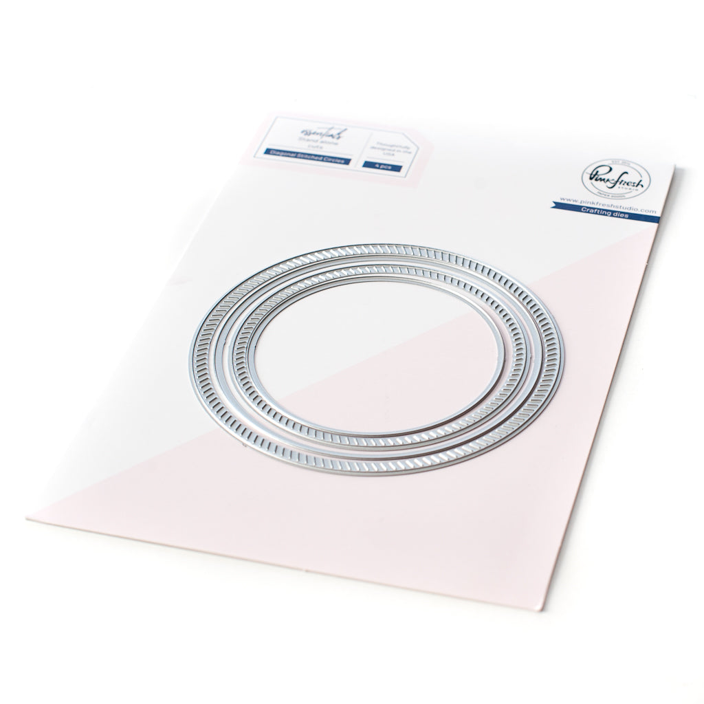 4 piece die set designed as an essential for crafting basics. Each element in this set is a separate die to give you added versatility and endless design options. Use them all together to cut perfect circles with the diagonal stitched edge, use the circles by themselves or use just the stitching to add texture to your project. Perfect for creating shaker cards, or framing your favorite photo on a scrapbooking layout.