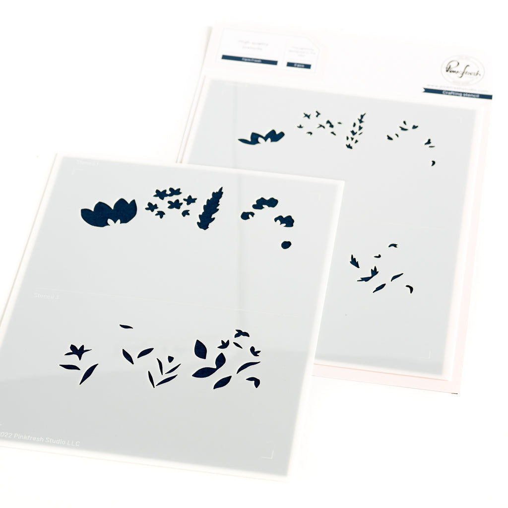 There is a separate stencil for each layer, with guidelines on each stencil for perfect alignment when using alone. There are two layers for the greenery, and two layers for the flowers, but we were able to condense them into just (2) stencils due to the smaller size of the stems. You will see an etched line separating the layers on each stencil. Use our smaller blending brushes to add depth and multiple colors to the stencil openings.