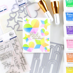 This die, designed by Kaitlin Sheaffer, features bold, modern rainbow arches, creating striking designs with ease. Coordinating product for purchase separately: Elevated Rainbows stencil Details: 4.25” x 5.5”, 1 piece Made of high-quality steel Packaging includes a finished example- $21.00