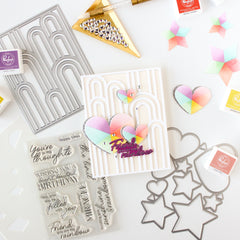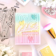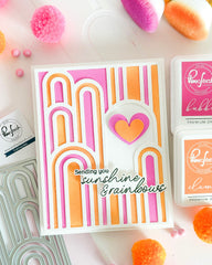This die, designed by Kaitlin Sheaffer, features bold, modern rainbow arches, creating striking designs with ease. Coordinating product for purchase separately: Elevated Rainbows stencil Details: 4.25” x 5.5”, 1 piece Made of high-quality steel Packaging includes a finished example- $21.00