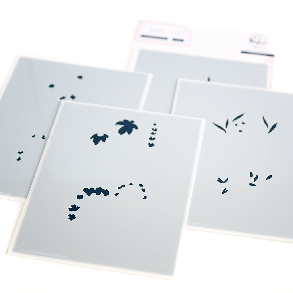 When using the stencils with the stamped image you will forego the alignment guides, and instead align each layer to the stamped images. While you can use them without the stamped image for a more abstract look, this set is more complete with the coordinating outline image found in the stamp set.
