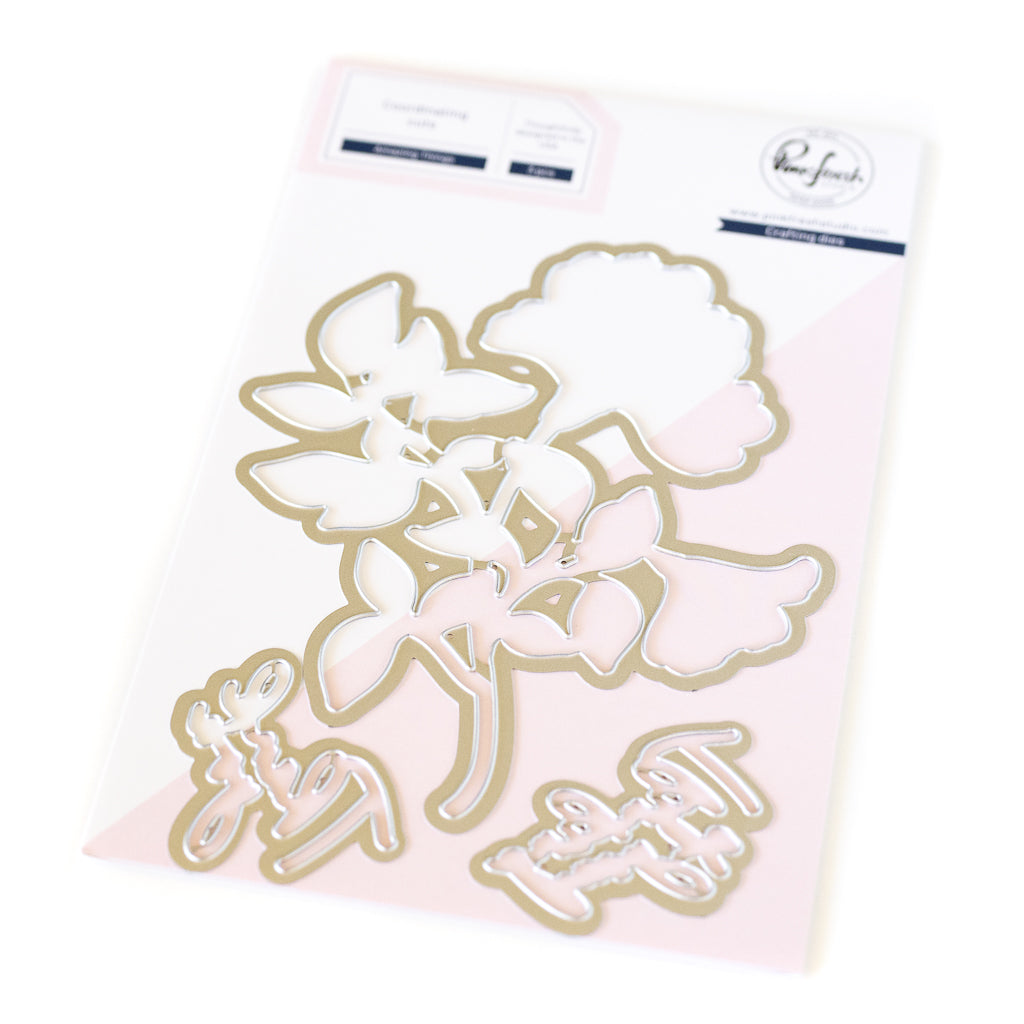 3 pc die set to coordinate with the Amazing Things stamp set, Amazing Things press plate and Amazing Things stencil set. There is a die that cuts around the floral stem, leaving a thin white border. There are also dies to cut around the two larger sentiments on the stamp set.