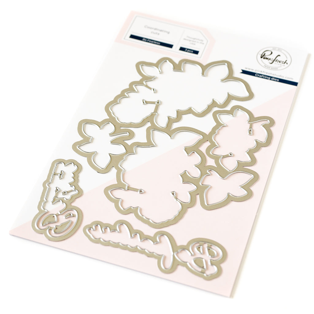 3 pc die set to coordinate with the Be Fearless stamp set, Be Fearless press plate and Be Fearless stencil set. There is a 1-piece die that cuts around the floral elements, leaving a thin white border around each item. There are also dies to cut around the two scripted sentiments on the stamp set.