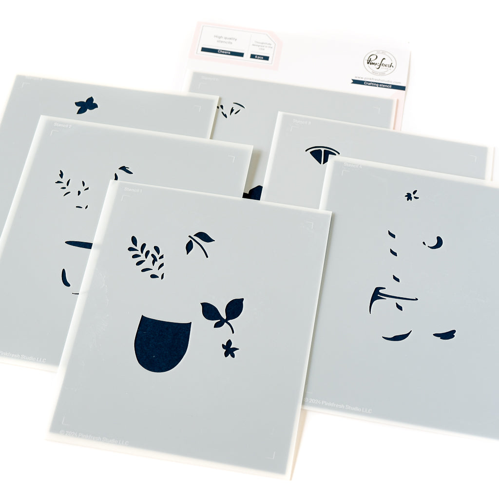 6 piece layering stencil set made to coordinate with the Cheers stamp set, Cheers press plate and Cheers die set.