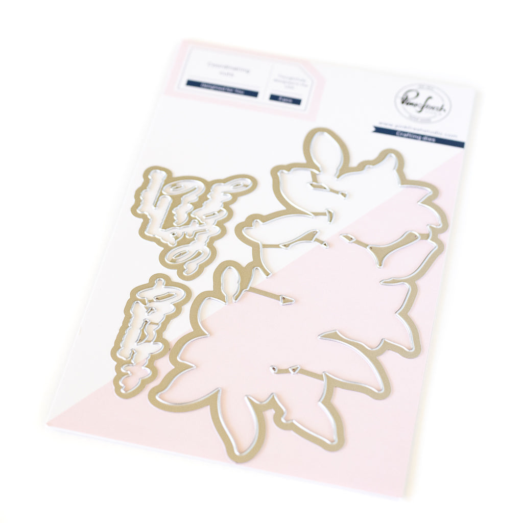3 pc die set to coordinate with the Delighted For You stamp set, Delighted For You press plate and Delighted For You stencil set. There is a die that cuts around the lilies cluster, leaving a thin white border. There are also dies to cut around the two larger sentiments on the stamp set.