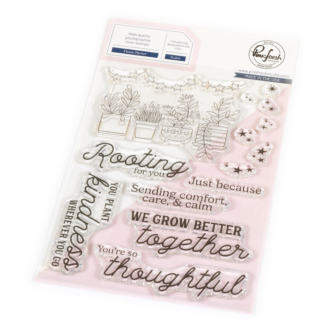Bring the charm of a market stall to your cards with the Flower Market stamp set designed by Inna Moreva. This delightful collection features potted plants, lavender, leafy greens, and twinkling stars, perfect for creating whimsical scenes. The coordinating sentiments encourage kindness, comfort, and togetherness.