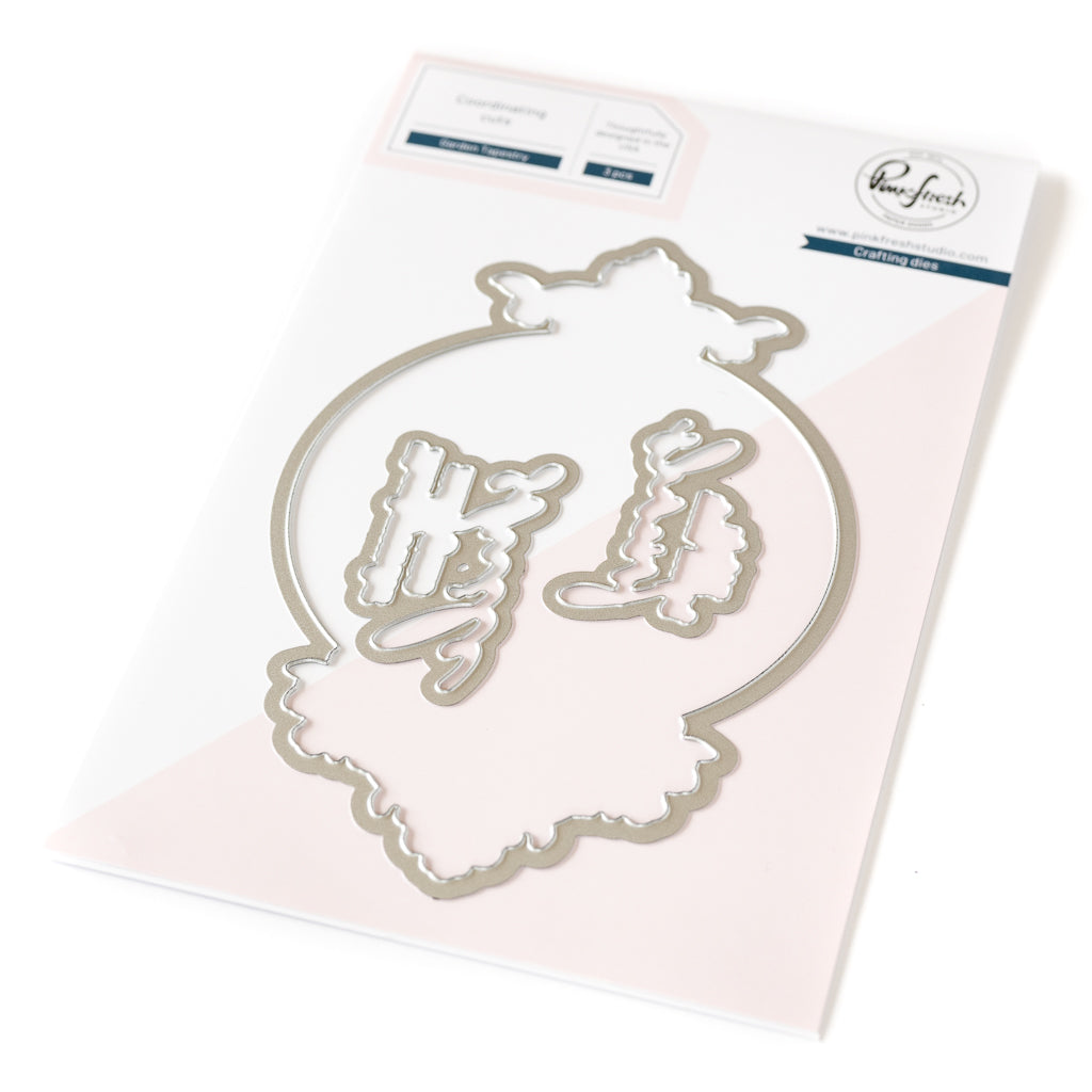 3 pc die set to coordinate with the Garden Tapestry stamp set, Garden Tapestry press plate and Garden Tapestry layering stencil set. There is a die that cuts around the Garden Tapestry image, leaving a thin white border. There are also dies to cut around the two larger sentiments on the stamp set.