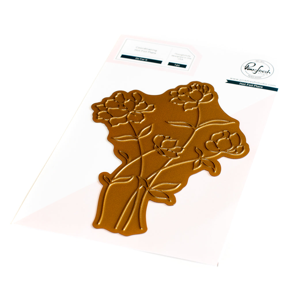 Create a stunning, letterpress feel to all your projects with a Pinkfresh feel using our beautiful hot foil plates! Designed to work in any standard hot foil system, be sure to follow the instructions in your manual for a standard hot foil plate. Once foiled, the delicate floral bunch is perfect for all types of coloring; including watercolor, alcohol & brush markers, colored pencils and no-line coloring. Combine with the coordinating Go For It layering stencil set to ink blend the images with all 48 shades of our premium dye inks. Use the coordinating Go For It die to cut out the image.