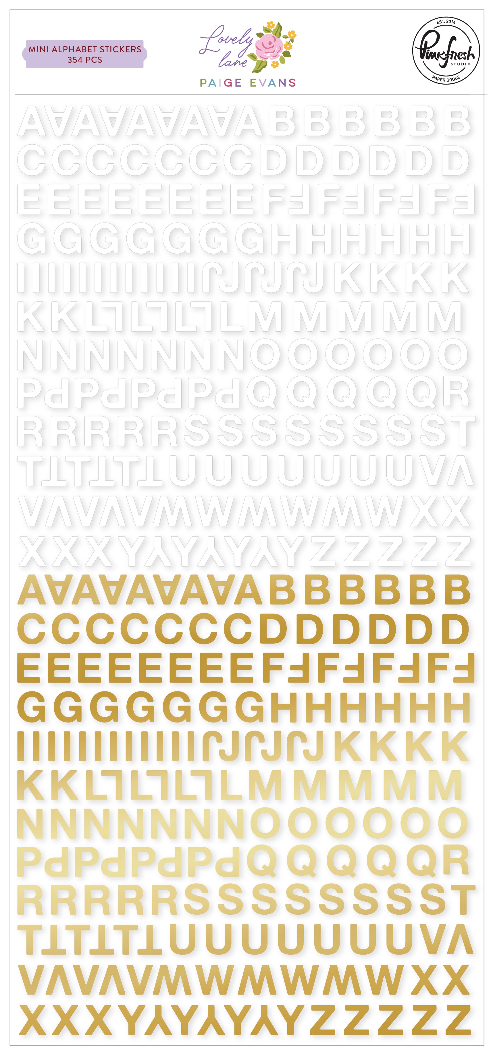 (1) 5 ½” x 11” sheet of puffy alpha stickers/354 pieces (half are metallic gold). Archival quality, acid-free.