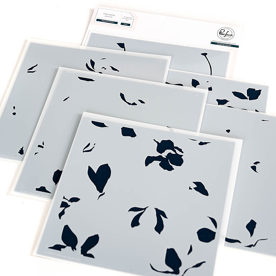 6 piece layering stencil set made to coordinate with the Magnolia Pattern cling stamp. There is a separate stencil for each layer, with guidelines on each stencil for perfect alignment when using alone. When using the stencils with the stamped image you will forego the alignment guides, and instead align each layer to the stamped images.