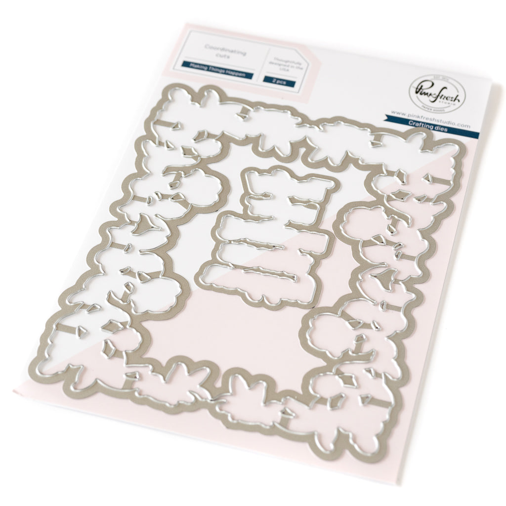 3 pc die set to coordinate with the Making Things Happen stamp set, Making Things Happen press plate and Making Things Happen layering stencil set. There is a die that cuts around the outside & inside of the frame, leaving a thin white border. There is also a die to cut out the larger sentiment included on the stamp set.