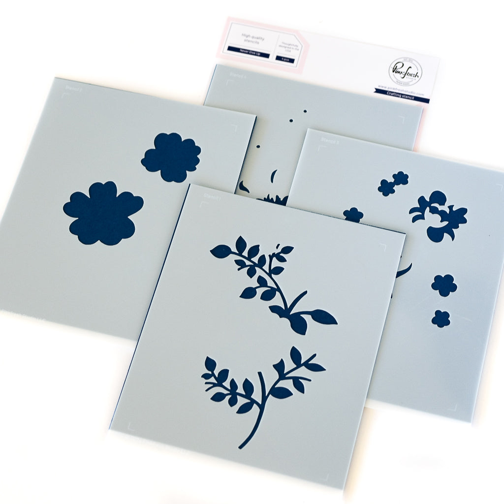 There is a separate stencil for each layer, with guidelines on each stencil for perfect alignment when using alone. When using the stencils with the stamped image you will forego the alignment guides, and instead align each layer to the stamped images. Use them without the stamped image for a softer look. Use the coordinating stamp to add more detail to the image by stamping with detail black or heat embossing in your favorite powder for added shine.