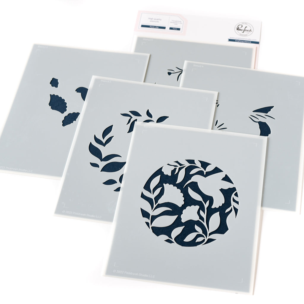 There is a separate stencil for each layer, with guidelines on each stencil for perfect alignment when using alone. When using the stencils with the stamped image you will forego the alignment guides, and instead align each layer to the stamped images. Use them without the stamped image for a softer look. Use the coordinating stamp to add more detail to the image by stamping with detail black or heat embossing in your favorite powder for added shine.