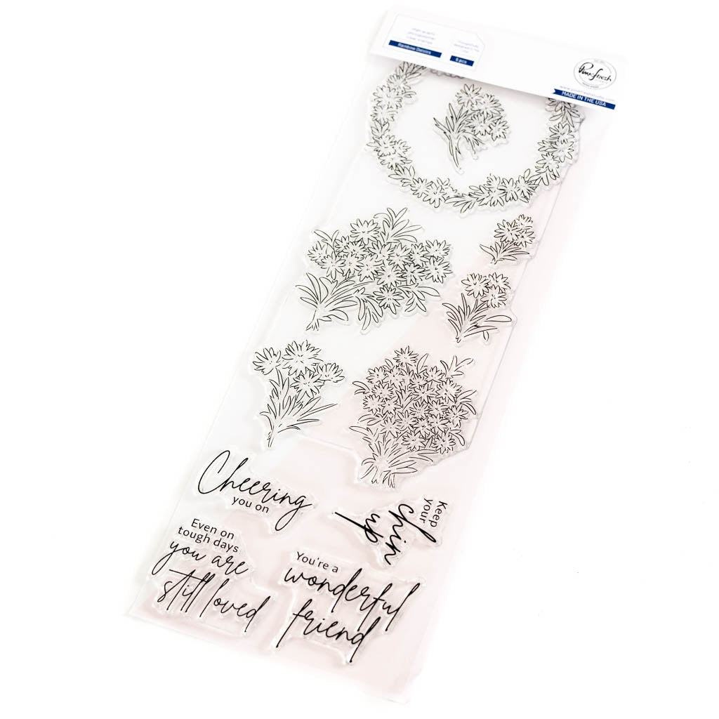 4 x 12 photopolymer clear stamp set designed by Valentine Leclerc. Made to coordinate with the Rainbow Daisies die, Rainbow Daisies layering stencils and Rainbow Daisies washi tape. Available for purchase separately.
