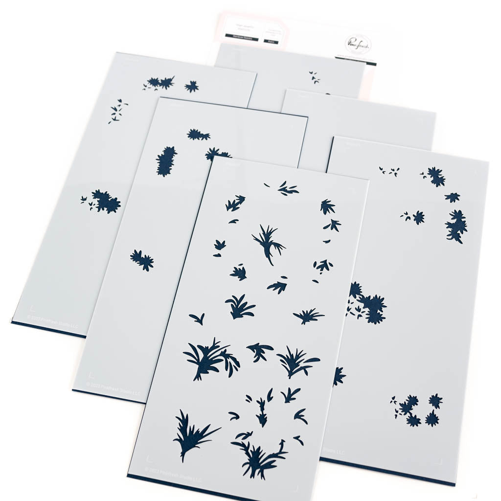 There is a separate stencil for each layer, with guidelines on each stencil for perfect alignment to a 3 ⅝” x 8 ⅝” cardstock panel when using alone. When using the stencils with the stamped image you will forego the alignment guides, and instead align each layer to the stamped image.