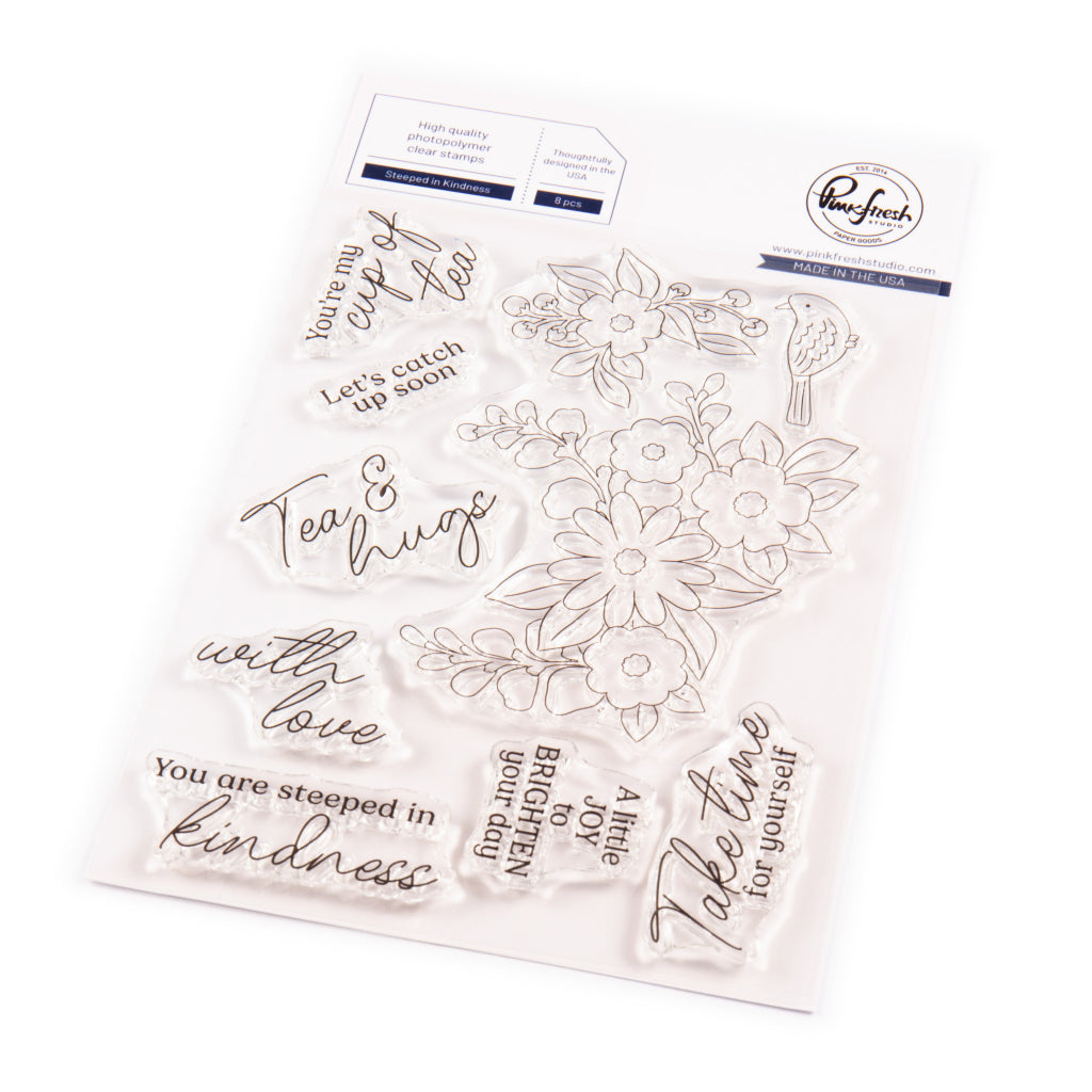 This tea-themed stamp set, designed by Paper Raven Co., is perfect for tea lovers. The centerpiece of this collection is a stenciled charming teapot adorned with delicate flowers. A sweet bluebird perches gracefully, adding a whimsical touch.