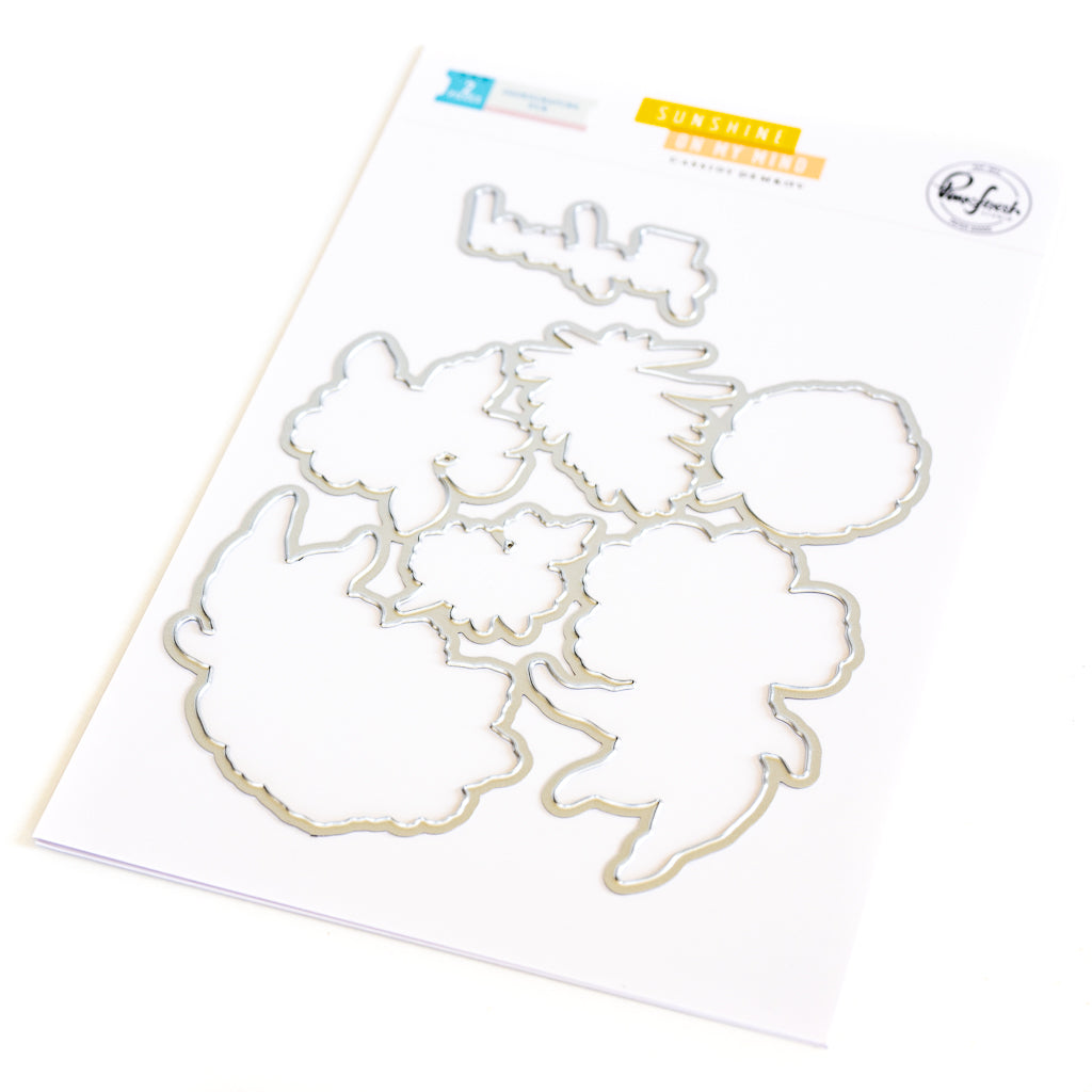 2 pc die set to coordinate with the Sunshine On My Mind stamp set and Sunshine On My Mind layering stencil set. The main die cuts around the flower and greenery images, leaving a thin white border. There is also a die to cut out the Hey sunshine! sentiment.
