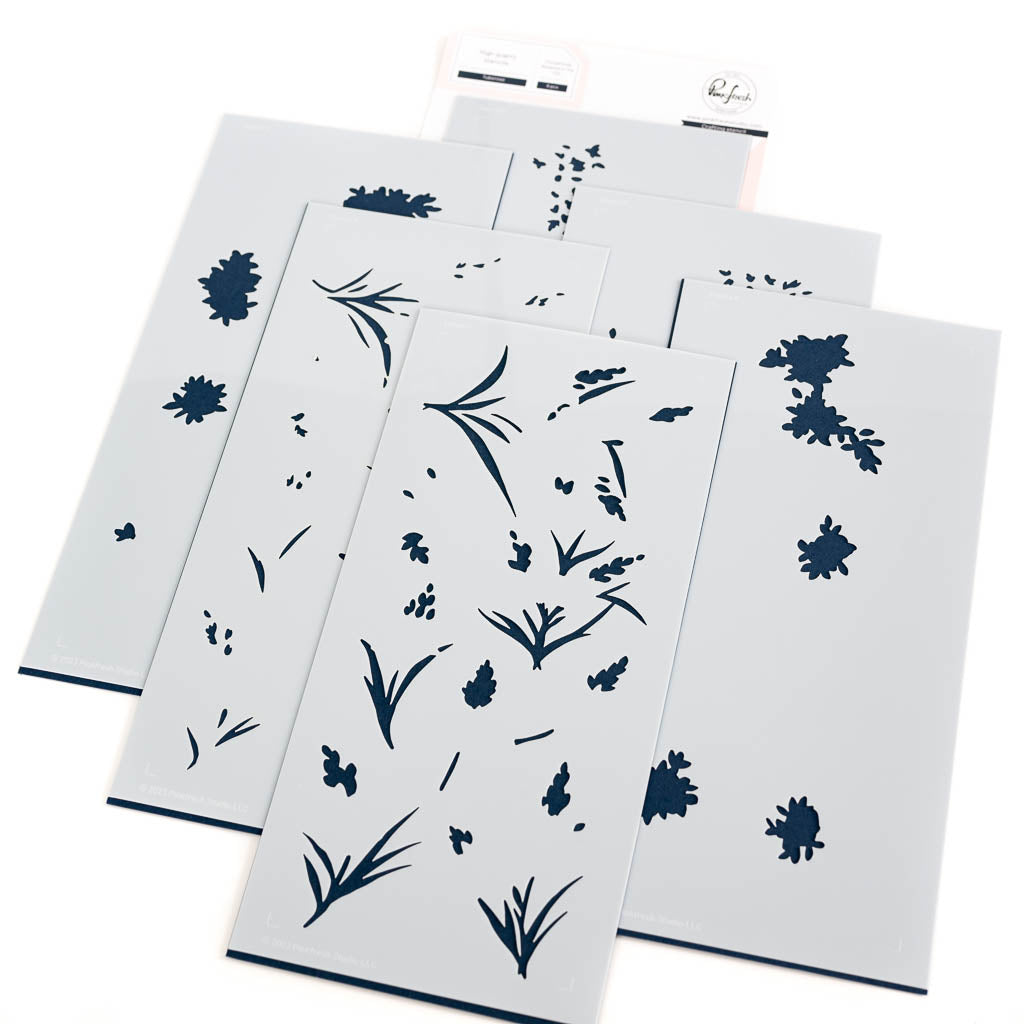 There is a separate stencil for each layer, with guidelines on each stencil for perfect alignment to a 3 ⅝” x 8 ⅝” cardstock panel when using alone. When using the stencils with the stamped image you will forego the alignment guides, and instead align each layer to the stamped image.