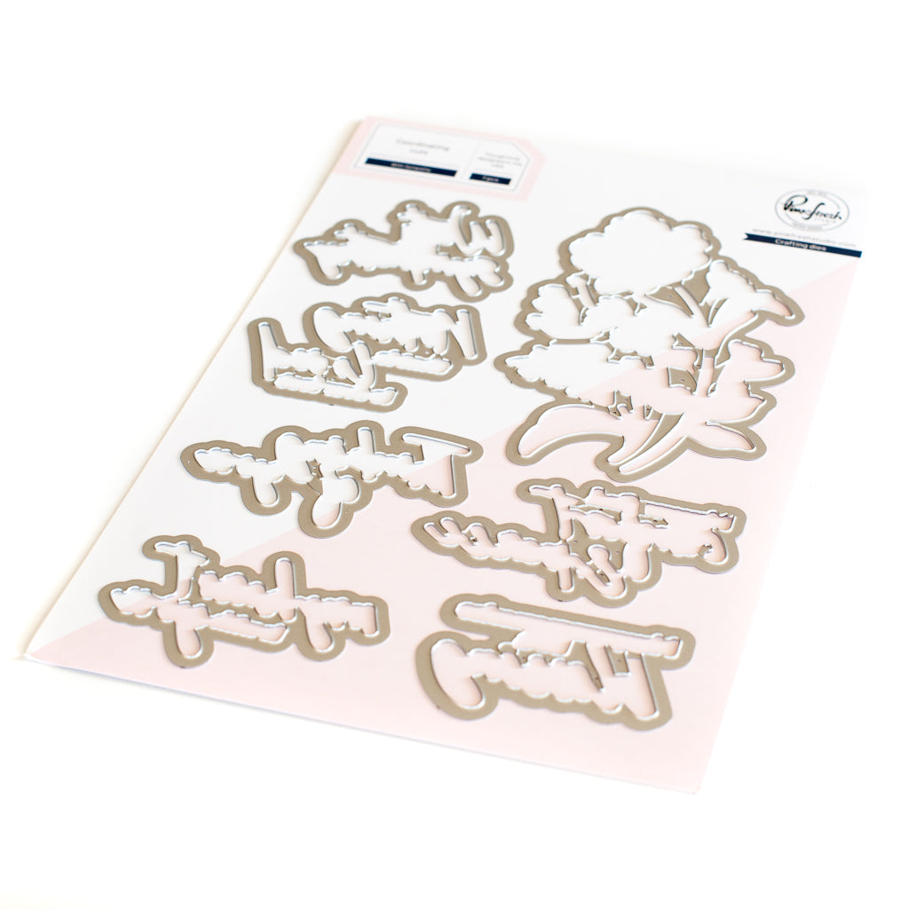 7 pc die set to coordinate with the With Sympathy stamp set, With Sympathy hot foil plate and With Sympathy layering stencil set. This die set cuts around the floral bouquet, leaving a thin border around the image. There are also dies to cut out the 6 main sentiments in the stamp set .