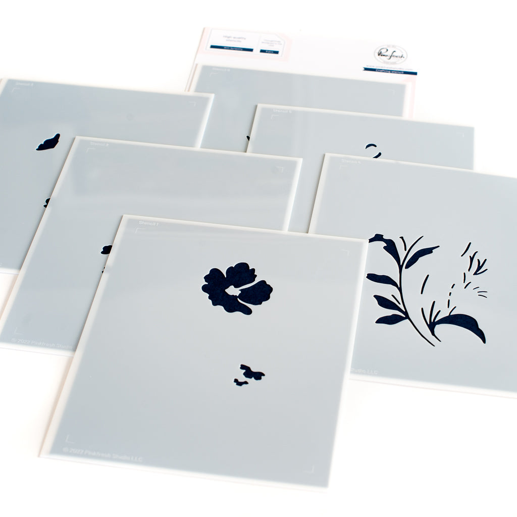 piece layering stencil set made to coordinate with the With Sympathy stamp set, With Sympathy hot foil plate and With Sympathy die. There is a separate stencil for each layer, with guidelines on each stencil for perfect alignment when using alone. When using the stencils with the stamped images you will forego the alignment guides, and instead align each layer to the stamped images.